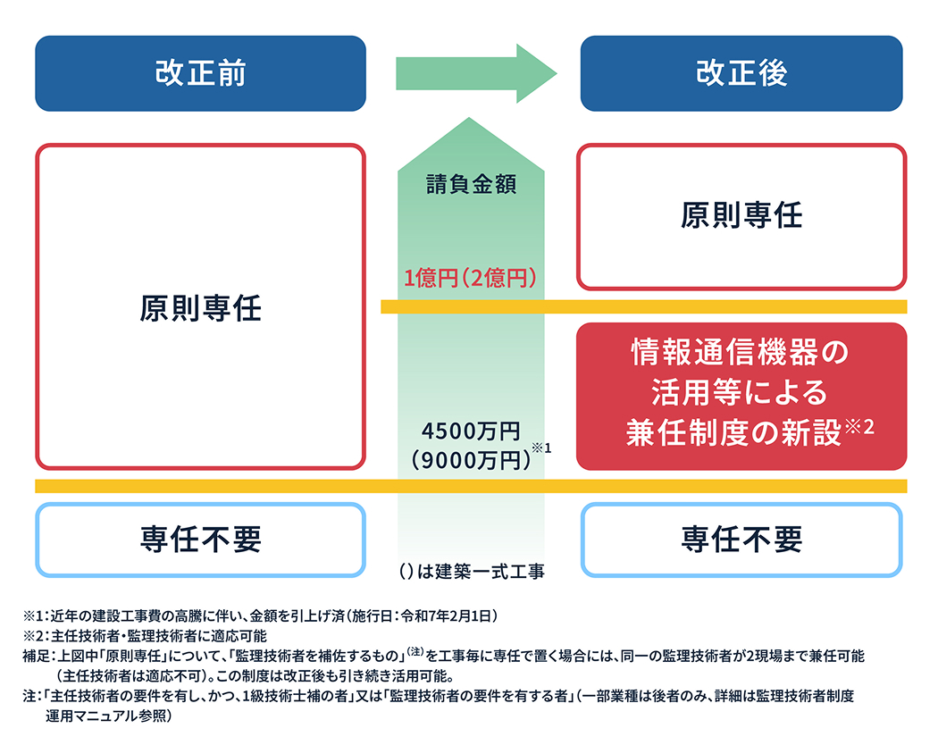 請負金額が1億円(建築一式工事の場合は2億円)未満の建設工事においては、情報通信機器を活用する等の一定の要件に合致する場合、営業所技術者等が当該工事の主任技術者等の職務を兼務できることとしています。