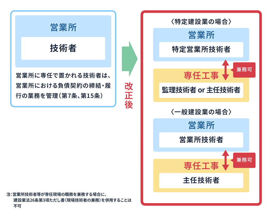 制度の合理化やICTを活用した生産性向上を目的とし、現場技術者の専任義務の合理化やICTを活用した現場管理の効率化に関する規定を新たに設けています。